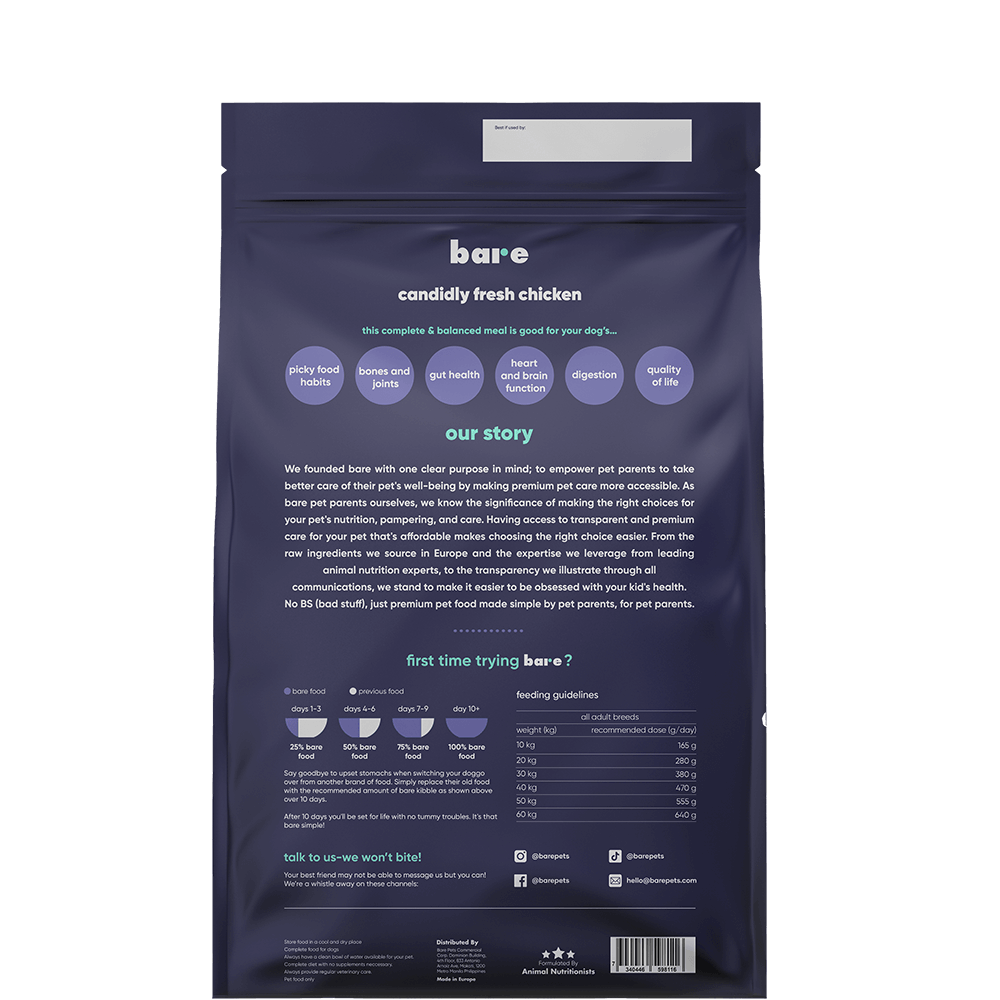 Kibble is a simple, safe, and affordable way to ensure a balanced diet for your dog. It promotes dental health, and nutritionists recommend it for their pets. Bare’s Adult Candidly Fresh Chicken Kibble meets the needs of adult dogs of all breeds and activity levels. For assistance, our customer service team is available, and please consult your vet for personalized health advice.